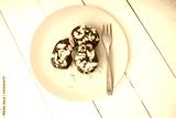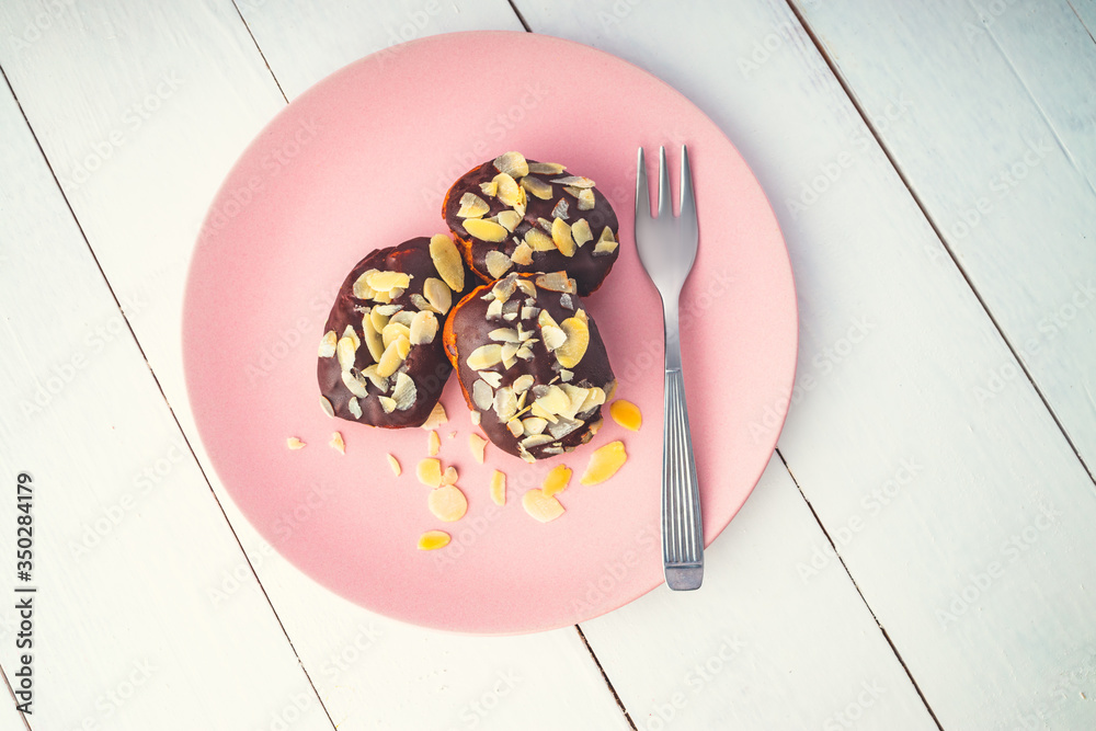 eclairs in a plate with chocolate and nuts over wooden background.