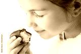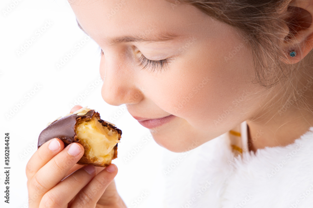 Little girl taste eclair pastry like a pro - smell, bite, eat