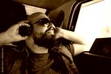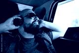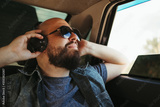 Young man traveling by car listening to music in wireless headphones. Technology, music app, leisure and relaxation