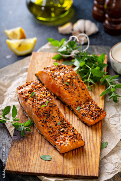 Cedar plank grilled or roasted salmon with herbs, garlic and spices