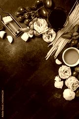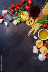 spaghetti, tagliatelle, tomato, basil, cheese, garlic and wine