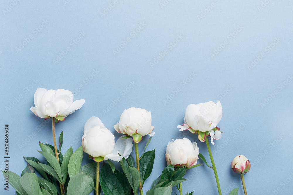 White elegant peony on the blue background. Concept of a greetings card, top view with a copy space for your text
