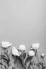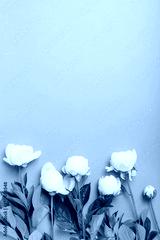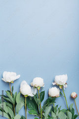 White elegant peony on the blue background. Concept of a greetings card, top view with a copy space for your text