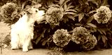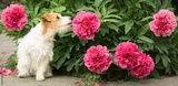 Cute small happy jack russell terrier pet dog puppy smelling peony flower in the garden, web banner