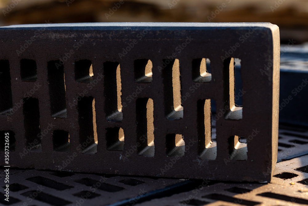 A stack of dark brown hollow bricks at a construction site at sunset. One brick on top of others