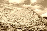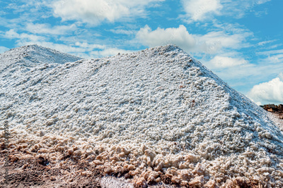 Brine salt farm with blue sky and white clouds. Pile of organic sea salt near warehouse. Raw material of salt industrial. Ocean salt. Summer travel in Thailand concept. Sodium chloride mineral.