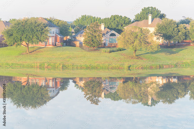 Two-story bungalow houses reflection on idyllic lake at suburban neighborhood near Dallas, Texas, USA