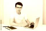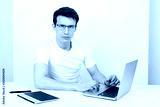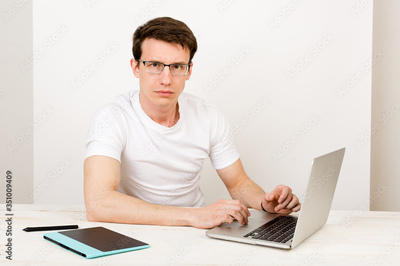 A handsome man with a light smile wearing a T-shirt and glasses sits against a white wall at his desk and work with a laptop. The concept of remote quarantine education and communication