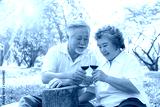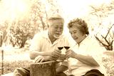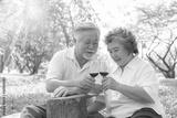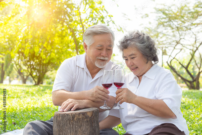 Senior asian couple cheering with wine glasses at park. Happy elderly couple having fun together. Senior couple having picnic. Grandparents celebrating wedding anniversary. Senior lifestyle concept