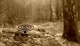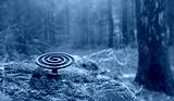 protective burning mosquito repellent on metal base, nature forest background. smoking spiral mosquito repellent. copy space