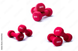 Set of red dumbbells isolated on white background. 3 pairs of red neoprene dumbbells. Home gym equipment for exercise at home. Weight training equipment. Small dumbbells for muscle strength building.