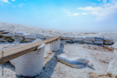 Brine salt farm with blue sky and white clouds. Pile of organic sea salt near warehouse. Raw material of salt industrial. Ocean salt. Summer travel in Thailand concept. Sodium chloride mineral.