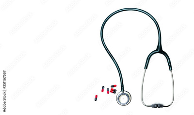 Stethoscope and red-black capsule pills on doctor table or nurse desk. Health checkup. Medical healthcare and medicine background. Physician tool for patient diagnosis. Cardiology doctor equipment.
