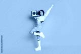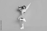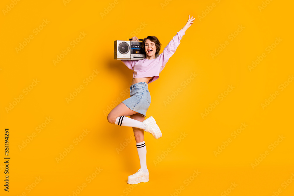 Full length body size view of her she nice attractive lovely cheerful funny girl carrying boombox having fun dancing retro vintage trend isolated on bright vivid shine vibrant yellow color background