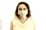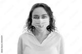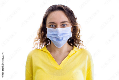 Woman wearing face mask at home. Covid-19 virus protection.
