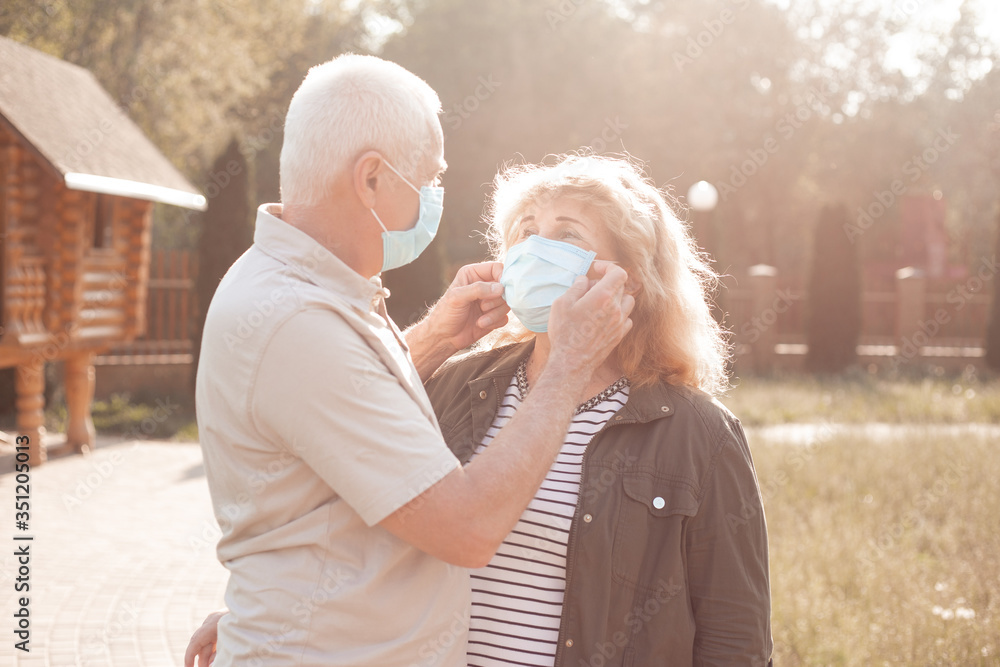 Happy senior couple in love wearing medical mask to protect from coronavirus. Park outdoors, coronavirus quarantine