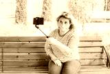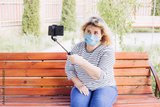 Senior woman making selfie in protective face mask respirator, outbreak of viral disease coronavirus covid-2019