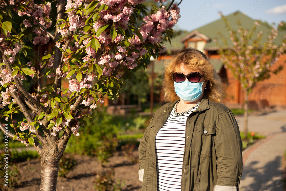 Senior woman in protective face mask respirator, outbreak of viral disease coronavirus covid-2019