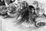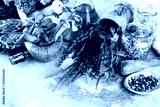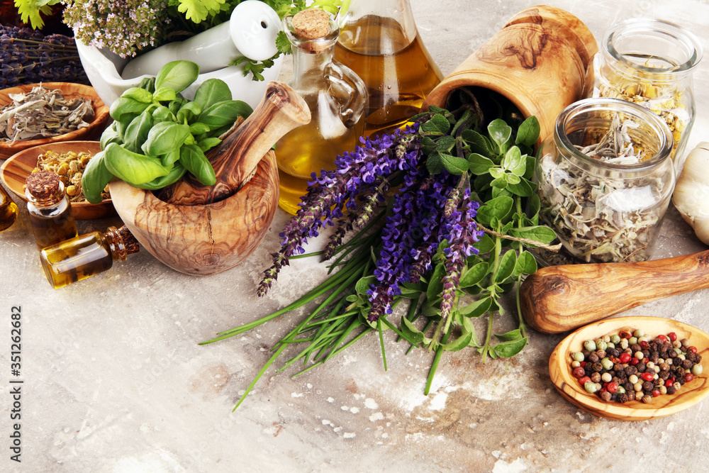 .Fresh herbs in mortar bowl from the garden and the different oils for massage and aromatherapy.