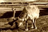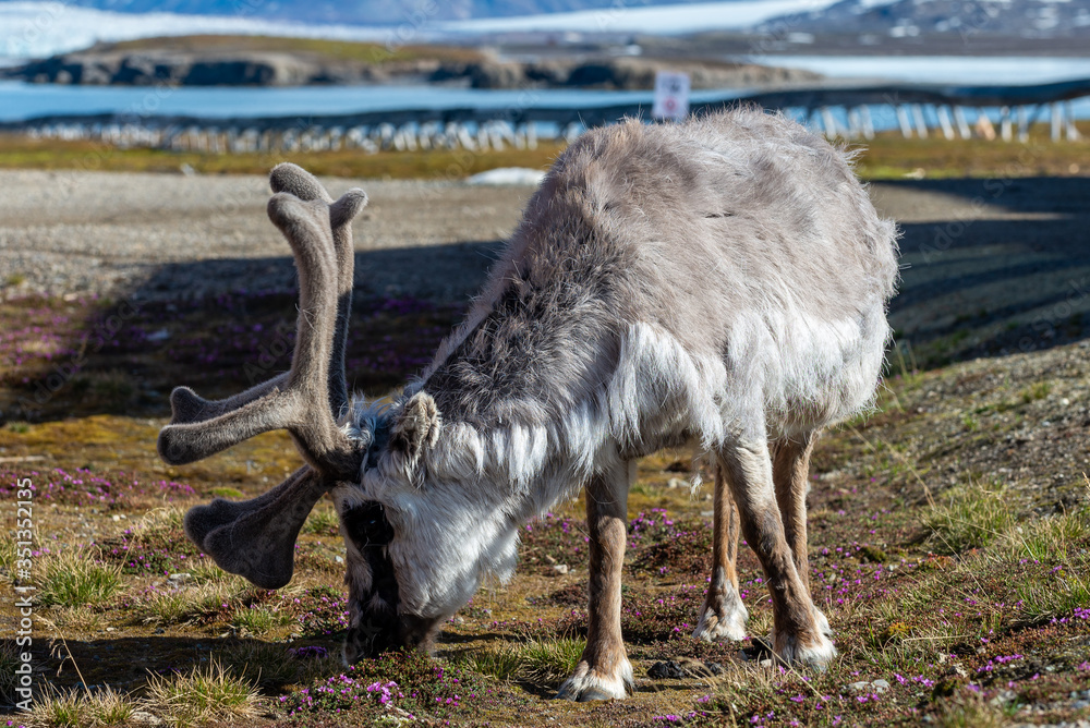 Wild reindeer in Ny-Alesund town at summer time close up