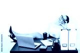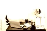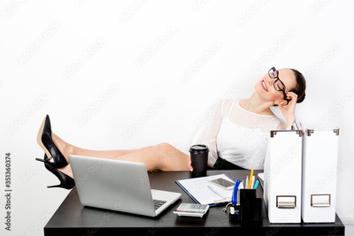 Attractive lady in strict clothes and glasses cozily threw her legs on her desk and closed her eyes dreaming with a smile on her face.