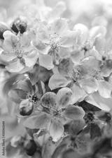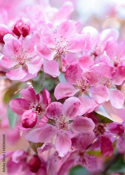 Macro photo of blossoming pink cherry flowers on a branch. Concept of the fresh air in spring garden.
