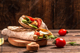 Tortilla wrap with asparagus, cherry tomatoes, avocado, chicken fillet and fresh salad. healthy food. Top view. space for text