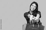 Shopping girl showing shopping bags with happiness, smiley face, copy space, yellow background. Asian young woman buy a lots of products, goods in shopping mall. Shopaholic enjoys buying when it sale
