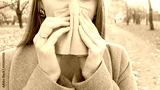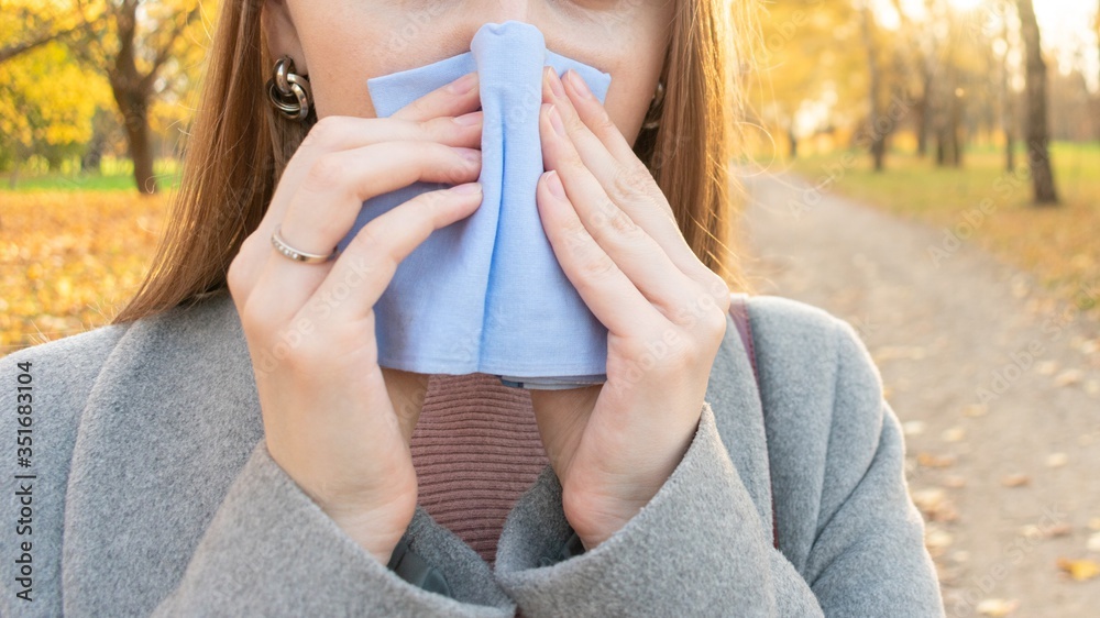 Sick woman blew her nose, blocked nose, female hands, cropped image, close up