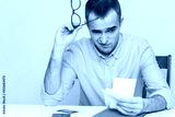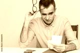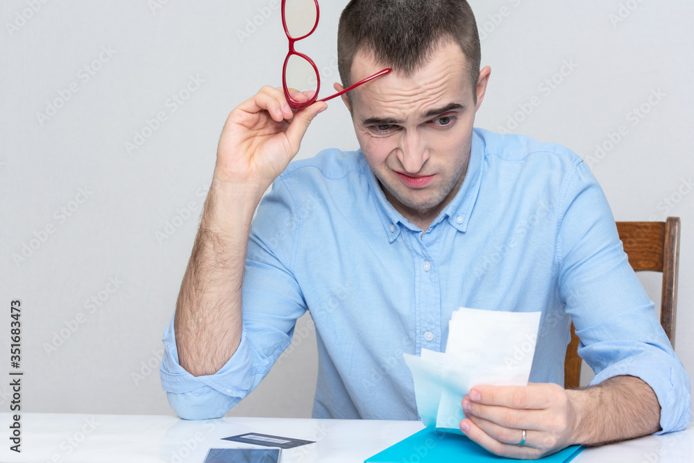 Sad man calculates family budget, getting stressed over finances in his home, portrait