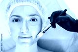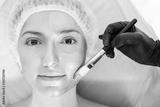 Nice woman looks directly into the camera while lying on a cosmetology table and applying a silver beauty mask to her skin with a brush. Skin cleansing and rejuvenation concept