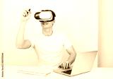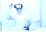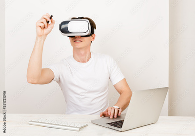 Male using virtual reality headset interacts with augmented things orienting in three dimensional space while sitting on his desk with keyboard and laptop on white background.