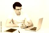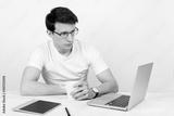 A handsome man with a light smile wearing a T-shirt and glasses sits against a white wall at his desk and work with a laptop. The concept of remote quarantine education and communication