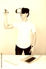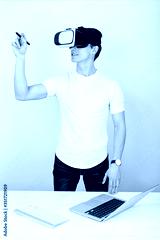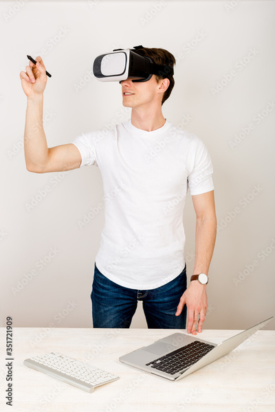 Male using virtual reality headset interacts with augmented things orienting in three dimensional space while sitting on his desk with keyboard and laptop on white background.