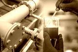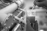 Chemical analysis at the enterprise. The job of a chemist in the workplace. The hands of the laboratory assistant hold the container with the sample of the substance.