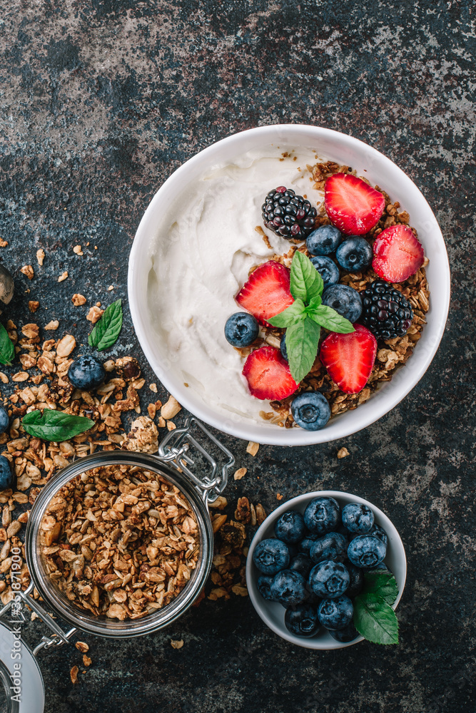Healthy breakfast with granola, yogurt, fruits, berries on dark metal background. Summer homemade breakfast.