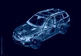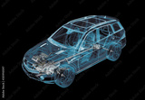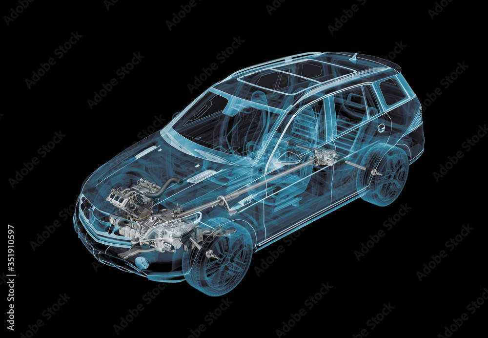 Technical 3d illustration of SUV car with x-ray effect and powertrain system.