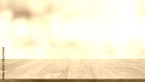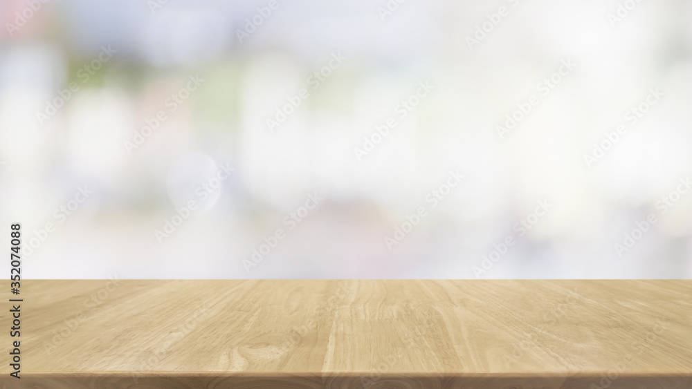 Empty wood table top and blur glass window interior restaurant banner mock up abstract background - can used for display or montage your products.