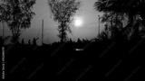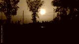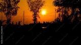 Silhouettes of walking people on the background of the sunset sky
