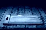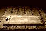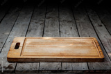 Wood cutting board on rustic wooden table in front with copy space display your food or products.