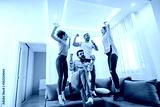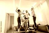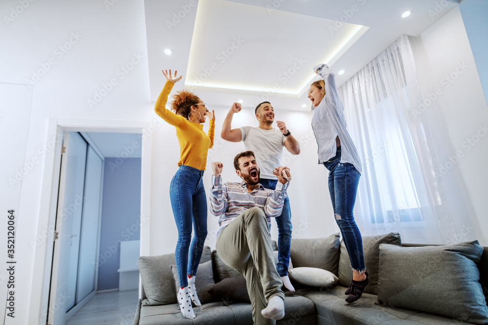 Group of cheerful best friends having fun at home. They are jumping on sofa and laughing.