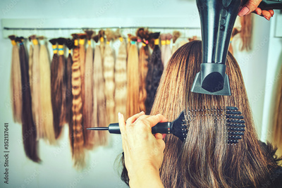 Hairdresser styling hair dryer in a beauty salon