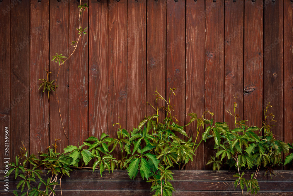 Brown board fence and the a climbing plant. Natural wood background for vintage design.