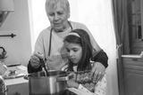 Grandma and granddaughter cook food in a pot on the stove in the kitchen