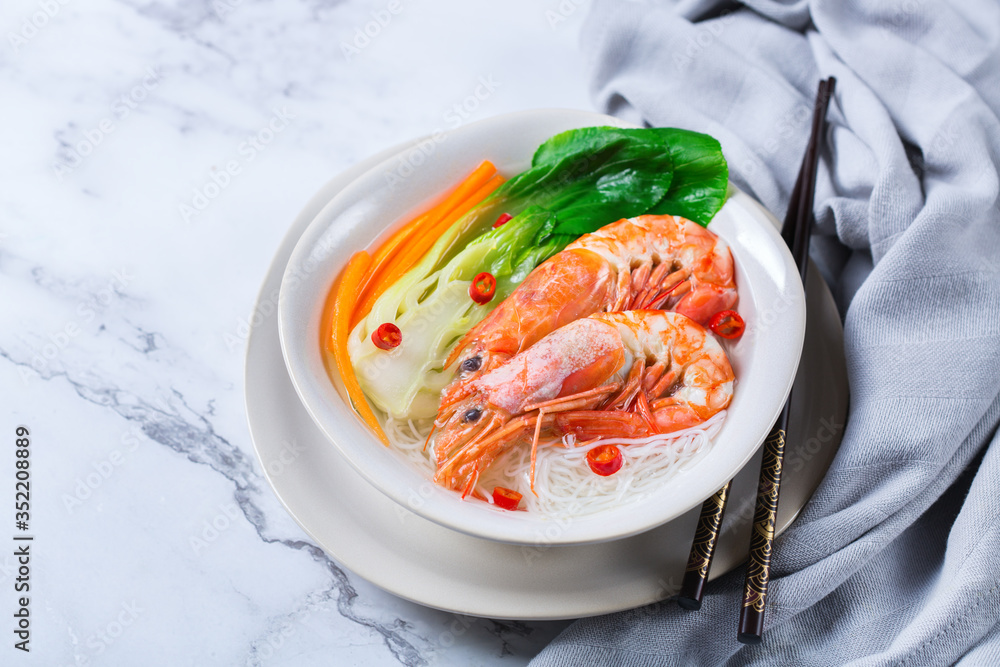 Asian bee hoon, bihun soup with shrimp, prawn, rice noodles