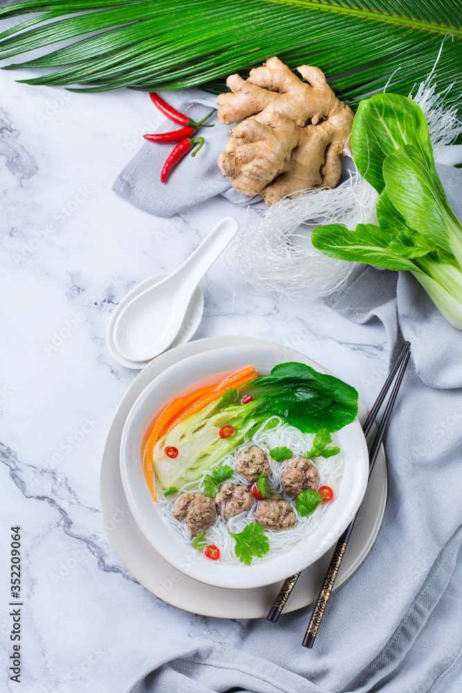 Asian bee hoon, bihun soup with pork balls, rice noodles