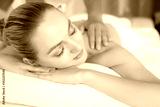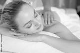 Beautiful woman get massage on back on spa bed at spa salon. Massage therapist massage, treatment back. Customer girl get relaxed, tranquility. Oriental massage in luxury spa room. spa concept
