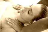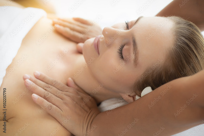Young woman get massage in spa salon at luxury spa room. Customer receiving shoulders massage on spa bed that make her relieve stressed Oriental massage therapist massage customer body. She get relax
