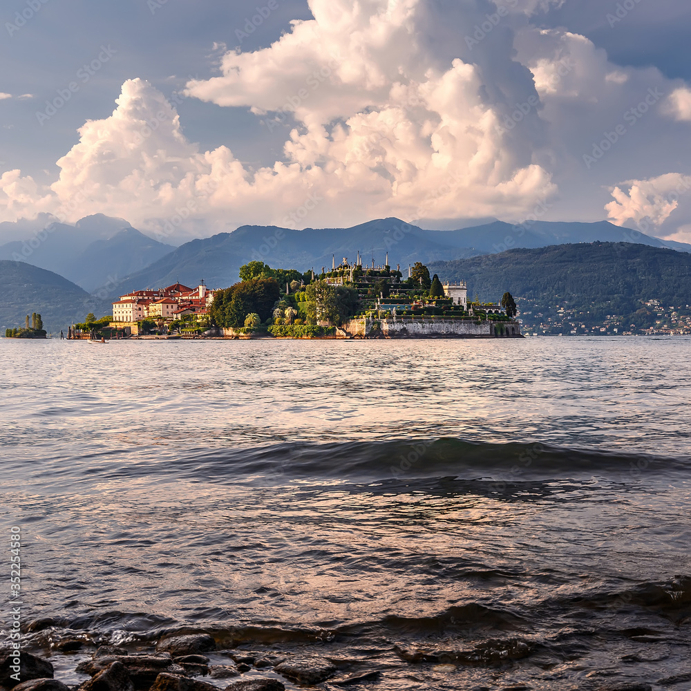 Wonderful Scenic view on beautiful Lake Maggiore among the mountains, Italy. Isola Bella. The island owes its fame to the Borromeo family who built a magnificent palace with a beautiful garden.