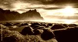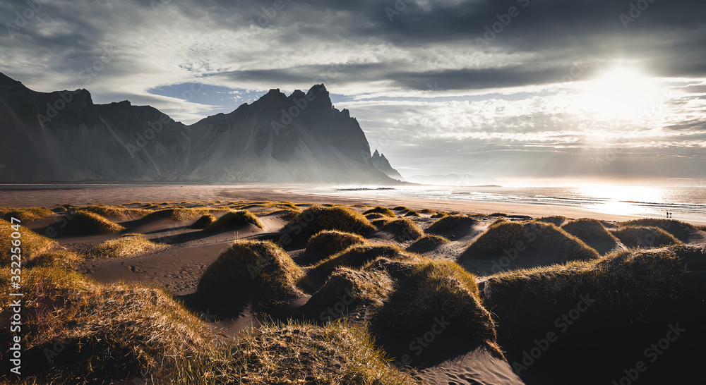 Impressive view of Vestrahorn mountaine on Stokksnes cape in Iceland during sunset. Amazing Iceland nature seascape. popular tourist attraction. Best famouse travel locations. Scenic Image of Iceland